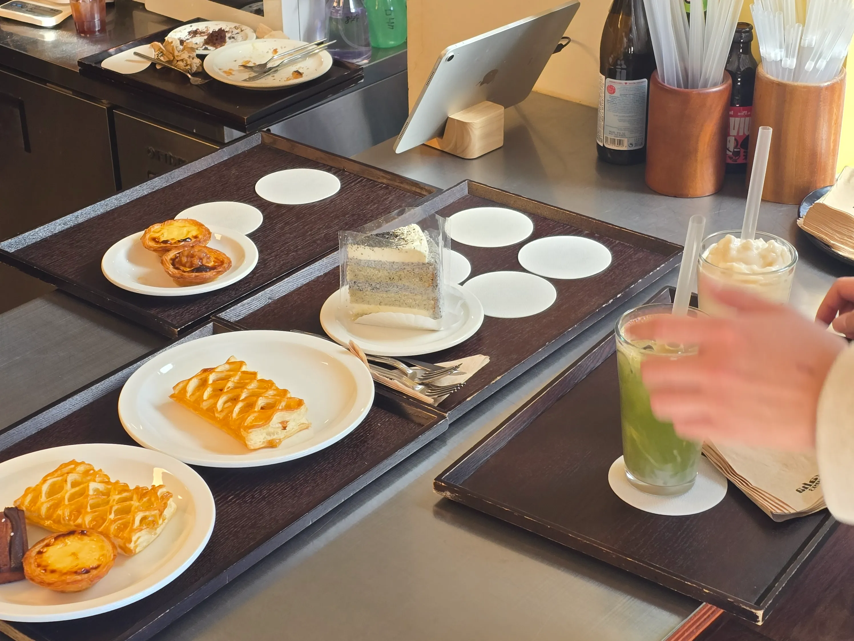 이날 내가 고른 음료는 말차미숫가루와 복숭아요거트스무디였다. 솔직히 음료 가격대가 저렴하다고는 할 수 없었다. 하지만 한 모금 마시는 순간 '아, 이래서 비싼 값을 하는구나' 납득이 갔다. 특히 복숭아요거트스무디는 진짜 과일을 갈아 만든다고 강조하셨는데, 과연 인위적인 단맛 없이 복숭아 본연의 상큼함이 고스란히 느껴졌다. 말차미숫가루도 진하고 고소해서 마시는 내내 만족스러웠다. (네이버 리뷰를 보니 라떼도 고소하고 산미 있는 커피도 맛있다는 평이 많았다. 다음엔 커피도 도전해봐야겠다.)