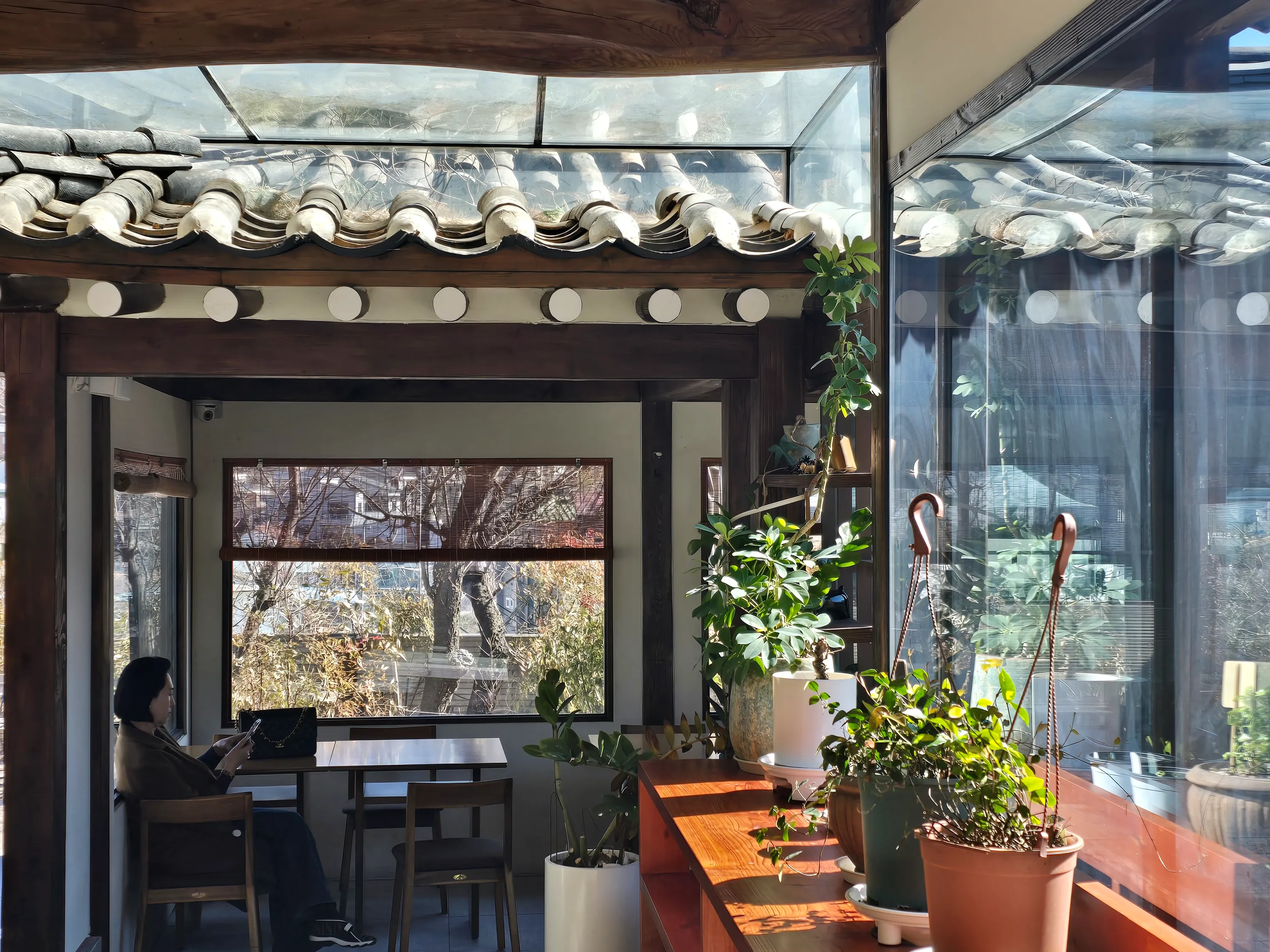 이곳의 가장 큰 매력 중 하나는 바로 따스하게 쏟아지는 햇살이다. 2시 30분쯤 방문했는데, 실내로 들어오는 볕이 정말 환상적이었다. 창가 자리에 앉아 햇살을 만끽하며 음료를 마시니 절로 힐링이 되는 기분이었다. 왜 리뷰마다 '뷰가 너무 좋고 서울 특유의 정취가 그대로 느껴진다'고 하는지 고개가 끄덕여졌다. 중정 덕분에 어디에 앉아도 시원한 개방감과 훌륭한 풍경을 감상할 수 있었다. 부모님을 모시고 오기에도 전혀 손색없는 곳이었다.