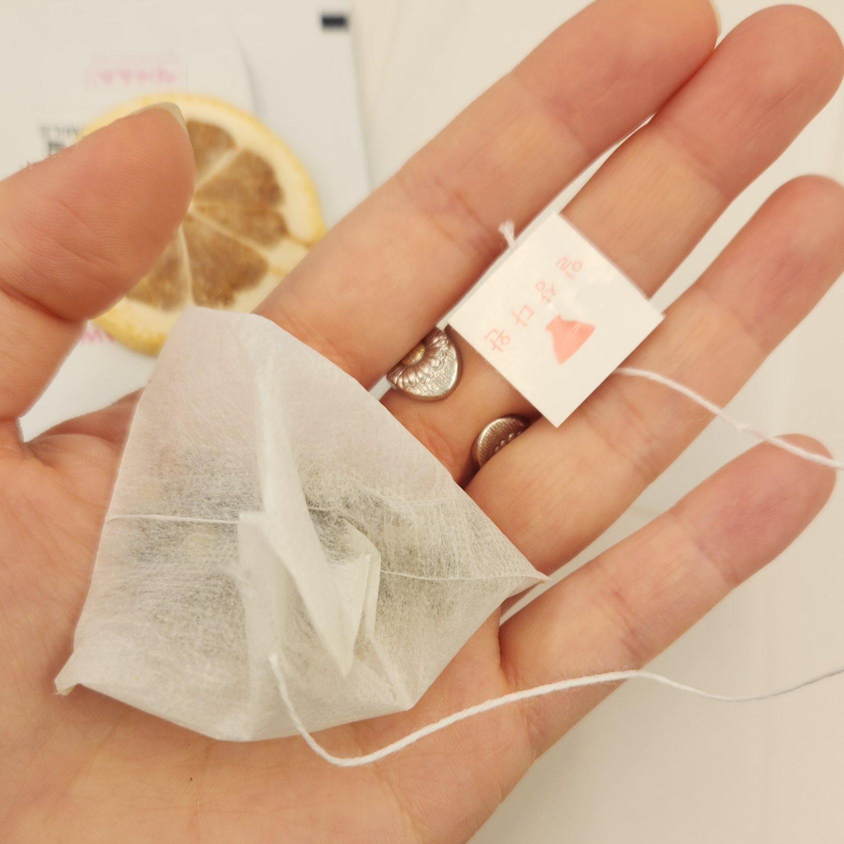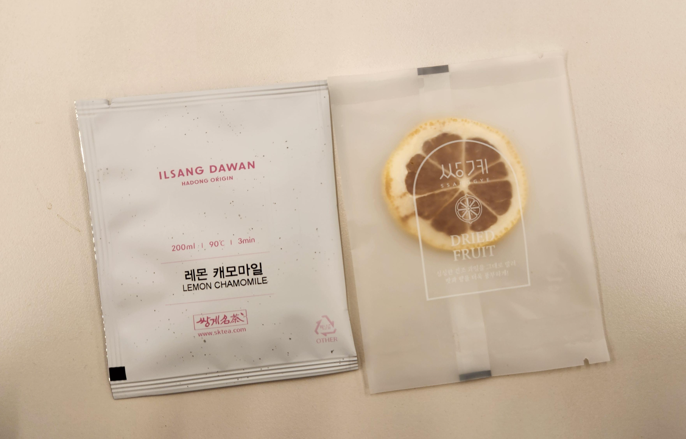 건조한 레몬칩과 티백이 한 봉지에 하나씩 들어있다. 따라서 두 봉지(팩)가 하나의 세트인 셈이다.