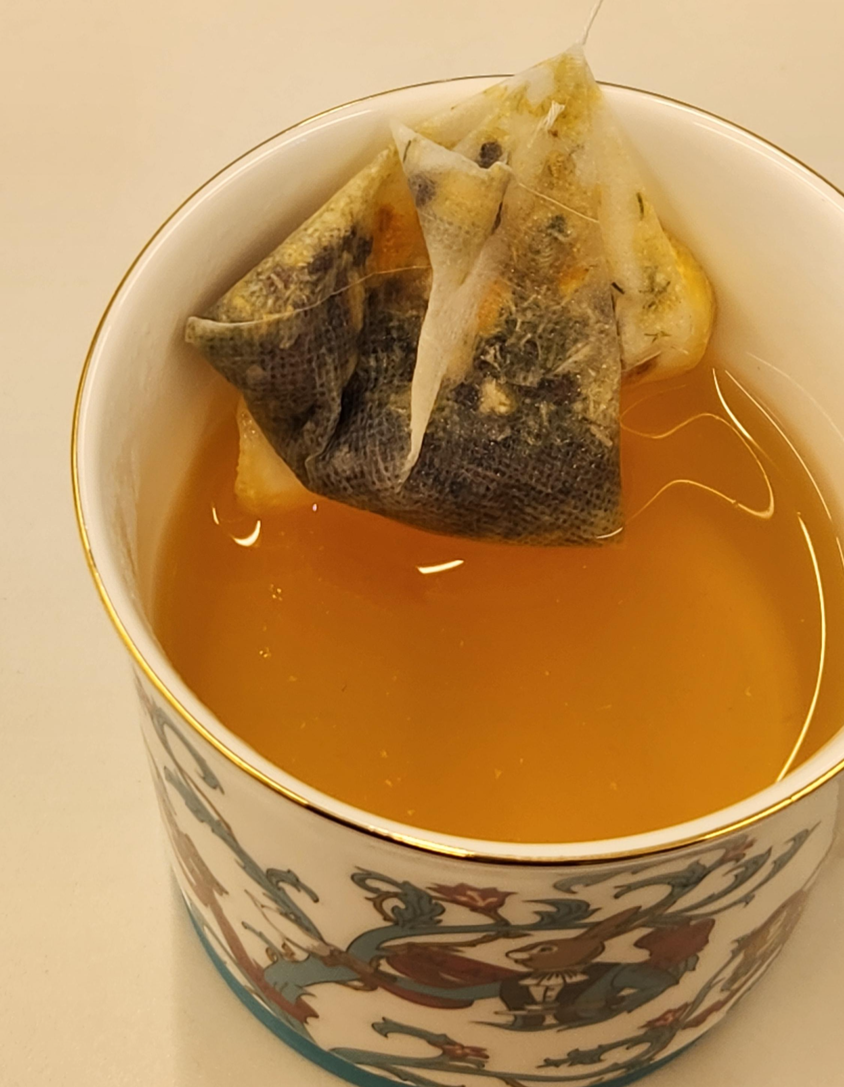 티백망이 조금 두꺼운 종이다. 다른 브랜드 티백 중에는 촘촘한 그물망?으로 것들이 꽤 많은데 이건 종이라서 안이 잘 보이지 않는다. 알고보니 자연을 생각한 생분해 필터라고 한다. 우러나는 것을 보니 안에 작은 귤피 조각도 들어있고 캐모마일도 들어있는데, 대강 보기에는 홍차의 비중이 가장 높아보인다.