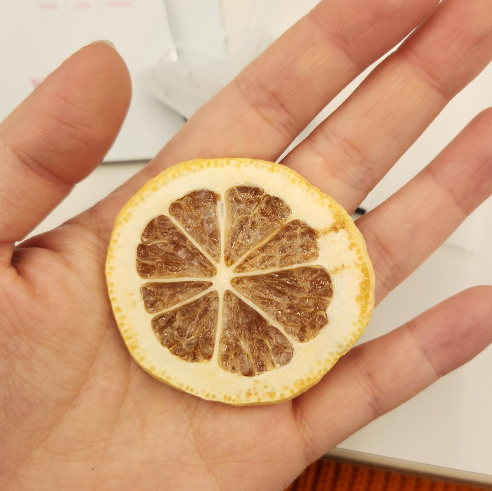 레몬칩은 따로 맛을 보지 않아 육안만으로는 유탕처리를 했는지 알기 어렵다. 일반적으로 건조시킨 과일칩의 인상을 준다.